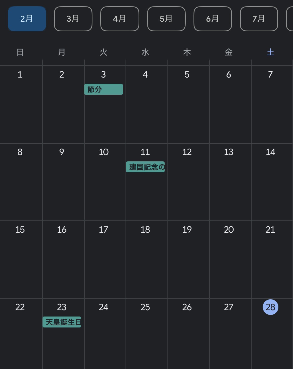 カレンダーって、月によっては1日が途中から始まって、最後の日が5段目や6段目にはみ出したりしますよね。でも、今月のカレンダーは、日曜日の1日から始まって、土曜日の28日でピタリと完結している。